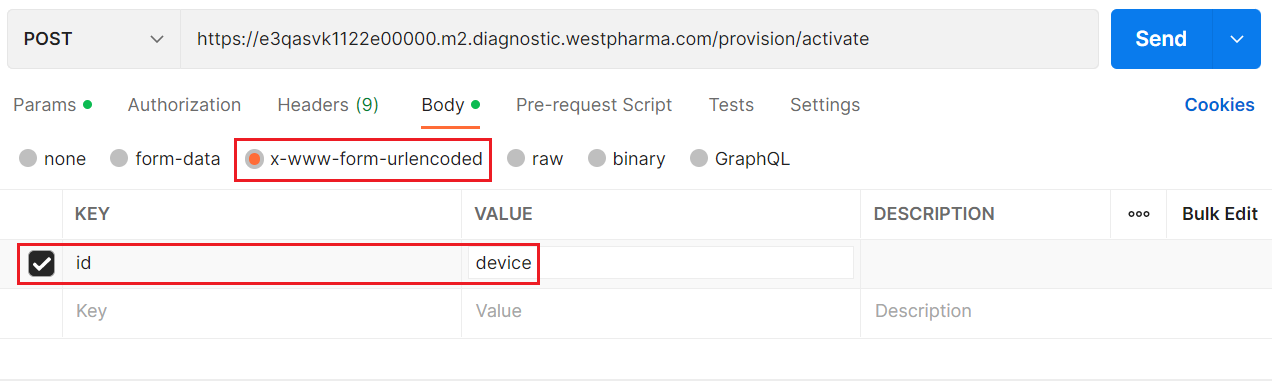 Add a x-www-form-urlencoded key named "id" with value <device-name> in Body.